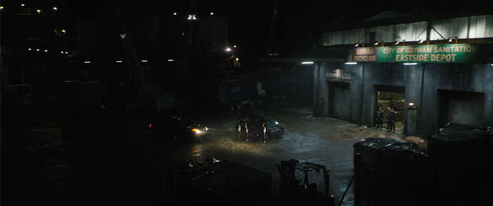 Auf einem Industriegelände im Gothamer Osten. Am Lager der Stadtreinigung läuft bei Regen ein zwielichtiges Geschäft ab.Nicht wiederzuerkennen: Colin Farrell als Oswald „Oz“ Cobblepot, besser bekannt als der Pinguin. Für das Make-up zeichnet sich Effekt-Maskenbildner Michael Marino aus.Selina Kyle auf einem Motorrad, ebenfalls bei Regen. Der Trailer möchte uns suggerieren, auch sie wäre bei der Szene zugegen.Eine Schießerei entfacht.Auch der Pinguin greift zur vollautomatischen Handfeuerwaffe.Das Batmobil befindet sich ebenfalls auf dem Industriegelände, wie am Hintergrund zu erkennen ist.Batman lässt die Turbine hochfahren.Stichflammen stechen aus der Motorhaube.Batman jagt den Pinguin.Pinguin: „Wahoo! Der Typ ist verrückt!“